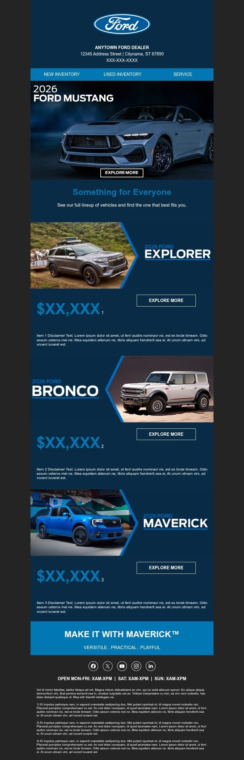 Emails created for Ford OEM co-op. Requires Ford branding and approvals. These email were approved for specific use by Vehicle manufactures. Specific dealership information would later be added to them.